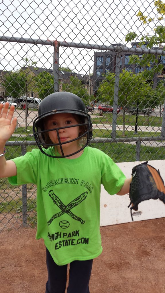 Every spring since Nora was 4, there was one evening a week of house league soccer at Souraren Park. Kate also started playing soccer when she was 4, but was never quite as into it as Nora. So last year we didn’t sign up for any soccer, and Kate tried out baseball lessons at Trinity Bellwoods instead. This year, Kate signed up for house league baseball at Souraren on Tuesday nights. She’s been enjoying it but it has been very hard being back at the park (especially since unfortunately Nora’s age group is there playing soccer on the same night).