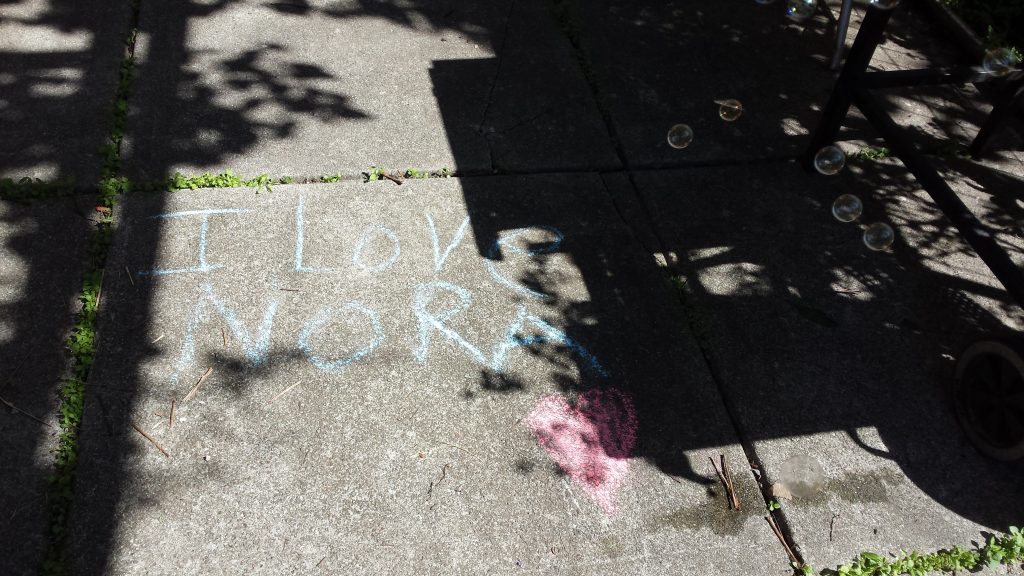 Kate had a PA day so we used the long weekend to go to the cottage. Before we left, she wrote “I LOVE NORA” in our backyard and blew bubbles onto it.
