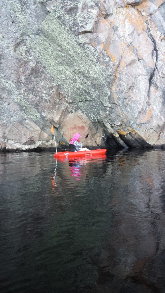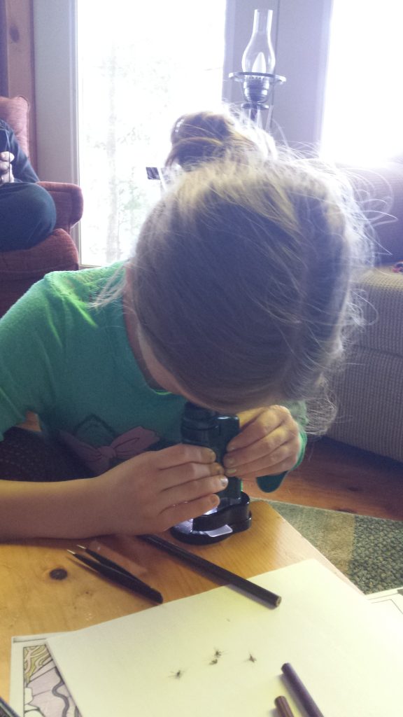 At the cottage, Kate & I got up early on Saturday and went paddling out on the lake and over to Bon Echo rock to visit the pictographs (Mishipeshu, and Nora’s favourite, Nanabush). The bugs – black flies & mosquitos – were horrendous, and even followed us out on the kayaks. Kate used the small microscope from Poppy for a close inspection of the bugs we caught inside.