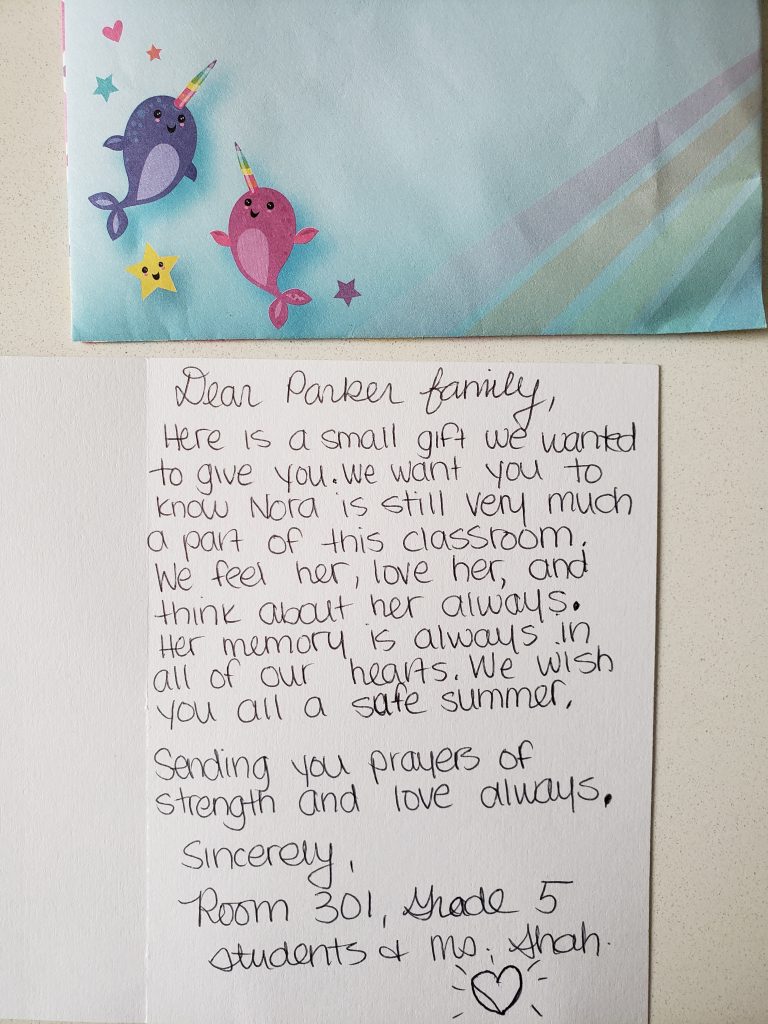 We received gifts and notes from Nora’s class, reminding us that they too were thinking of her at this time. They also sent home messages and a card at Christmas time; both were very thoughtful because they remind us that she is still with the class ‘in spirit’ as they celebrate these milestones without her…