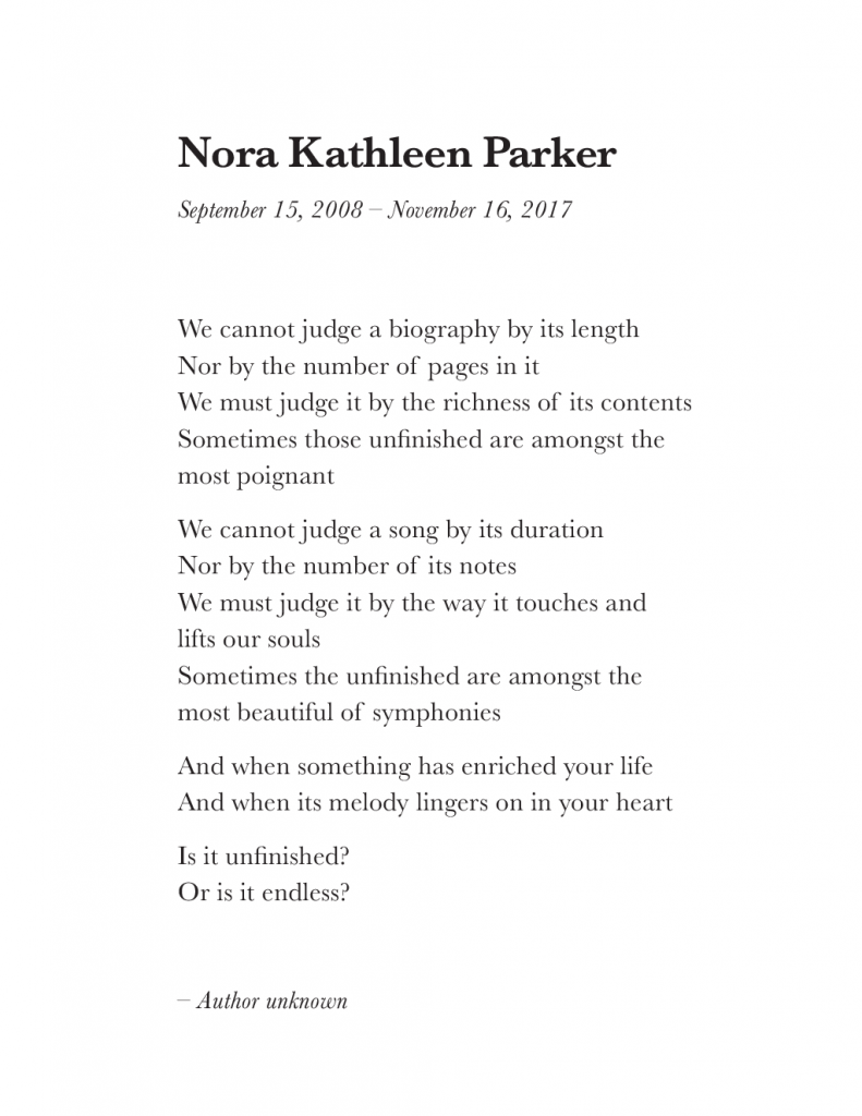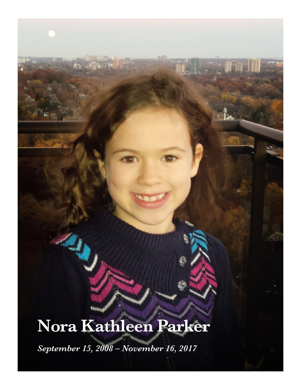A private family burial for Nora will be held in Gores Landing on Monday, November 20. A kid-friendly celebration of Nora’s life will take place at Lula Lounge, 1585 Dundas St. W., on Saturday November 25, details to be confirmed shortly.